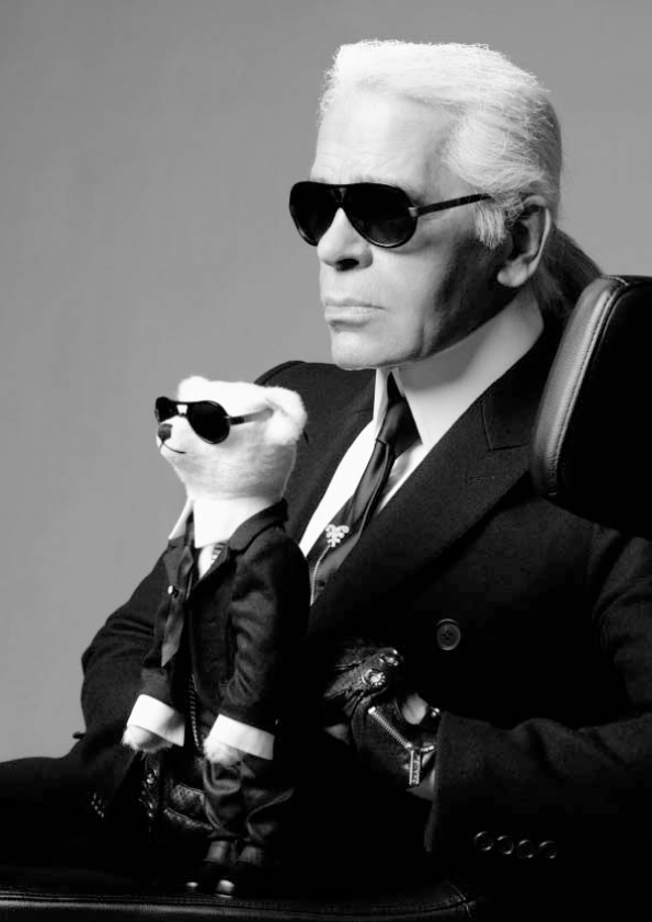 Lagerfeld har en svart kavaj i italienskt ylle, vit poplinskjorta med hög krage, jeans med patina från KL collection, svart sidenslips med knapp, läderbälte med KL i kristaller, handgjorda skor och glasögon från Lagerfeld eyewear. Dessutom är kartongen exklusiv - vit, blank och klädd med speglar inuti - KL villl ju gärna se sig själv!!!!